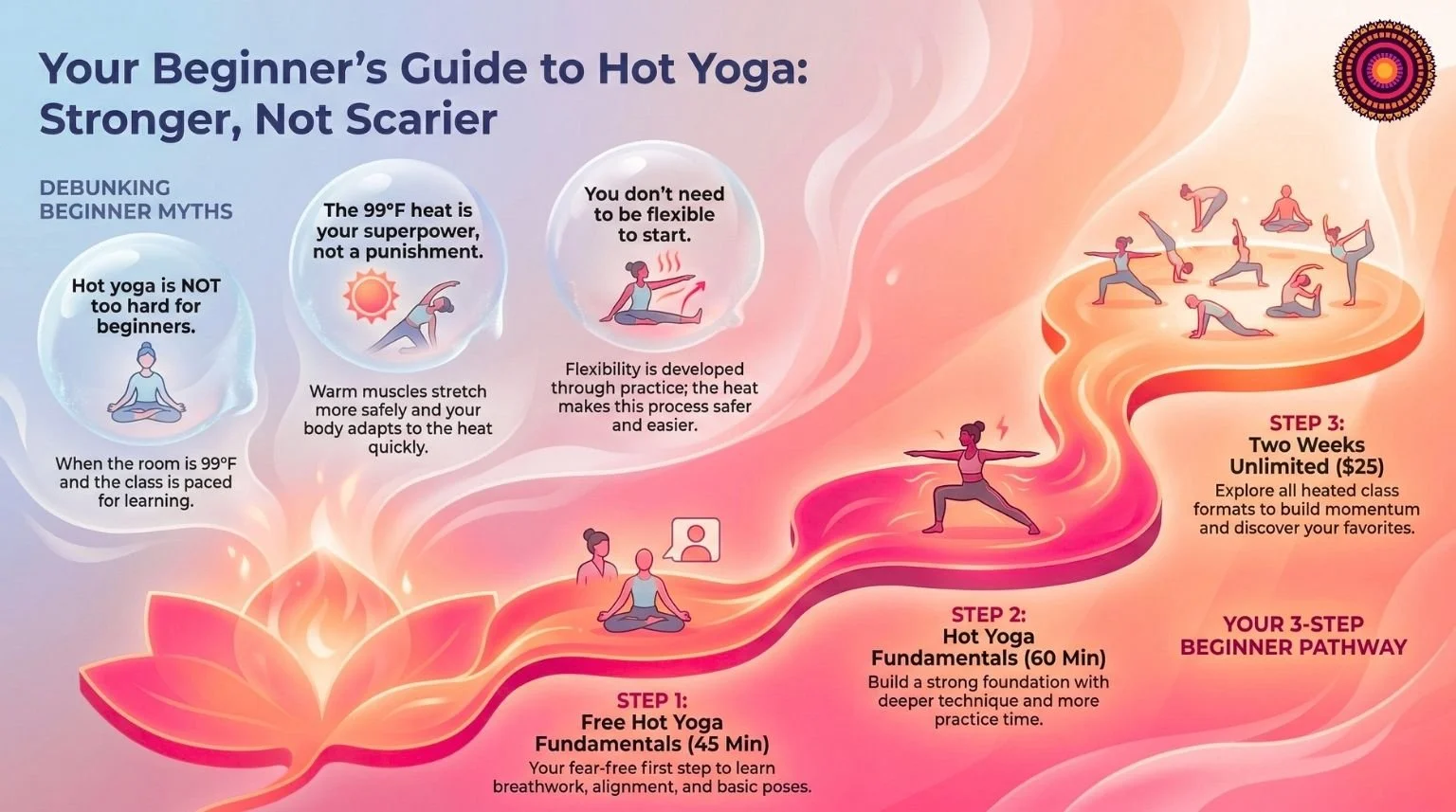 Hot yoga is not too hard for beginners when the room stays around 99 °F, the class is beginner-paced, and you learn foundational breath and alignment first.