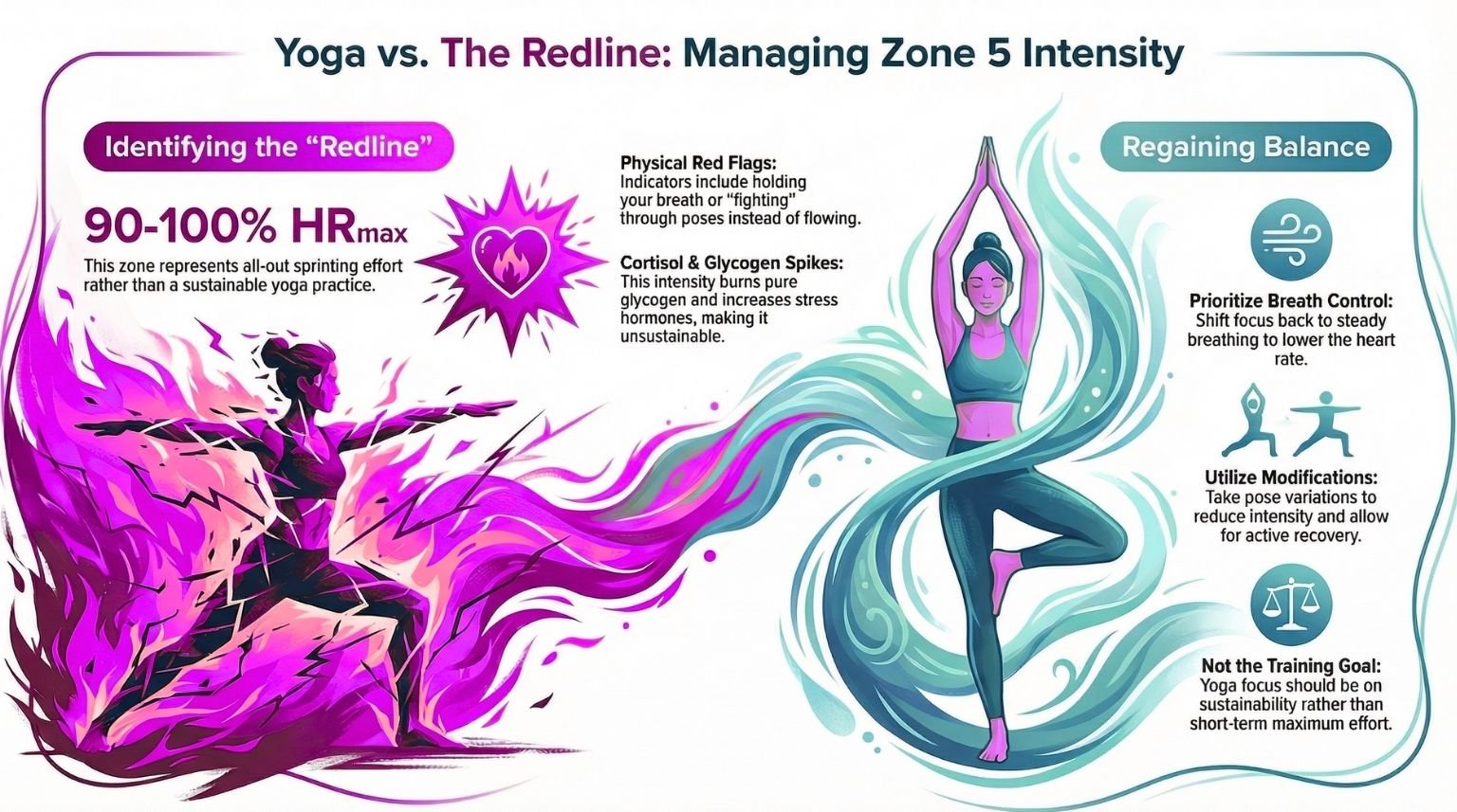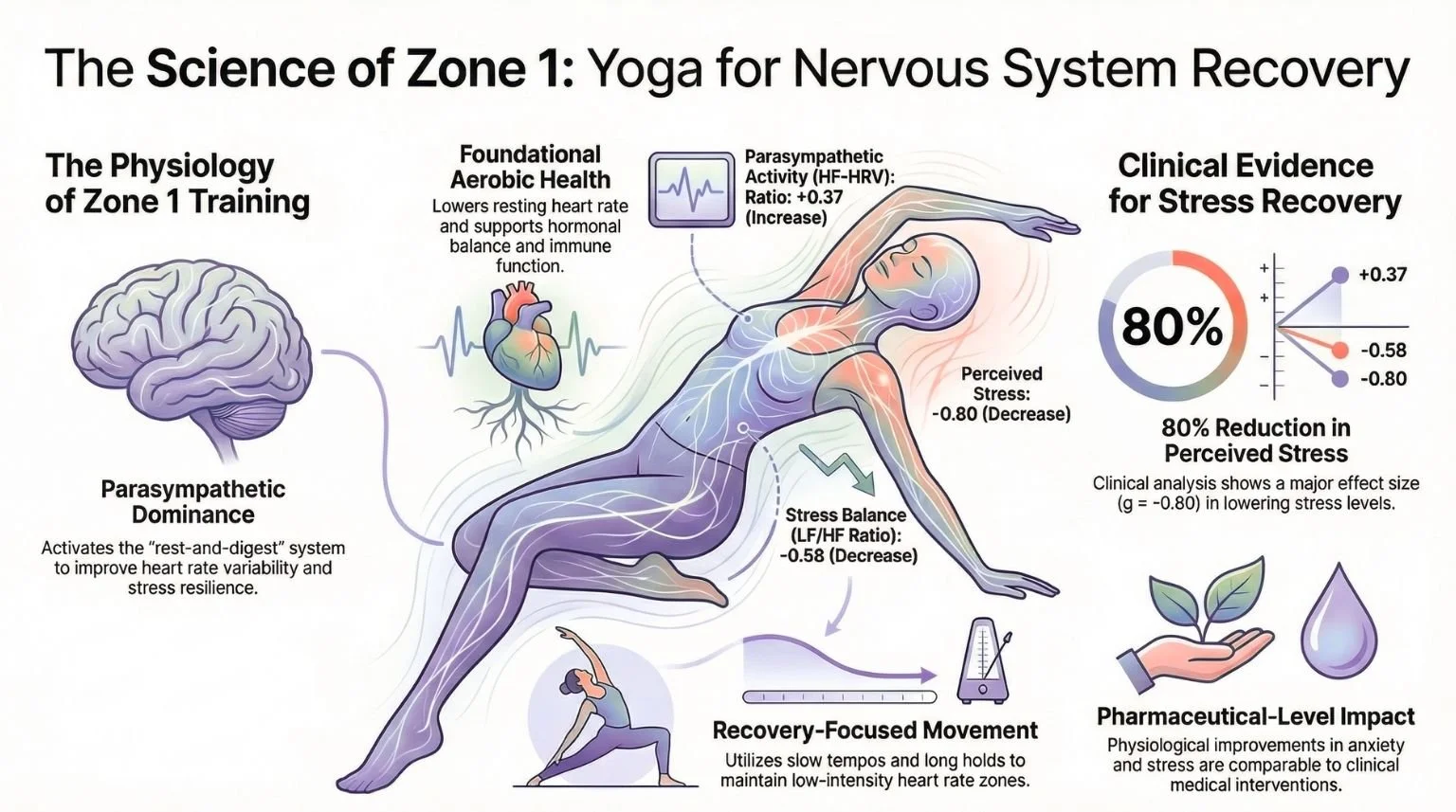 Why Zone 1 Training Is Underrated: Lower-intensity, breath-regulated yoga produces significant improvements in HRV and cortisol regulation — benefits that require parasympathetic activation, not sympathetic overdrive (8, 12).