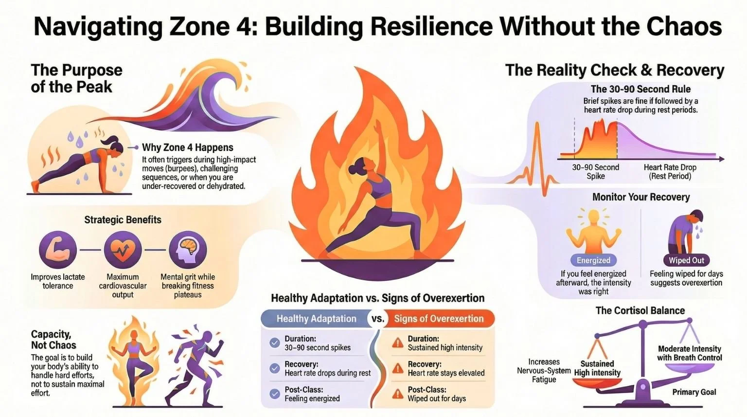Individual variation matters: If you're newer to fitness or still heat-adapting, these classes may push you into Zone 3 or even Zone 4 during challenging sequences. That's okay — it means you're getting a cardiovascular training effect. As you get fitter, your heart rate will stay lower during the same work.