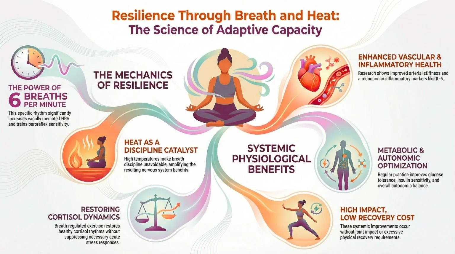 Heat elevates heart rate through thermoregulation, not dangerous overexertion, while breath-controlled movement improves heart-rate variability (HRV) — the key marker of stress resilience, autonomic balance, and cardiovascular health (1, 2).