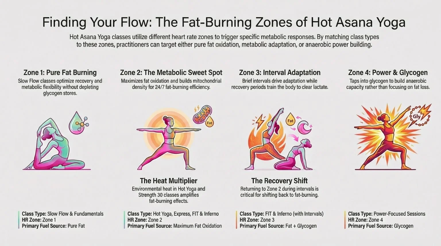 At Hot Asana Yoga Studio, classes are intentionally designed to target specific heart-rate zones — each with distinct benefits: