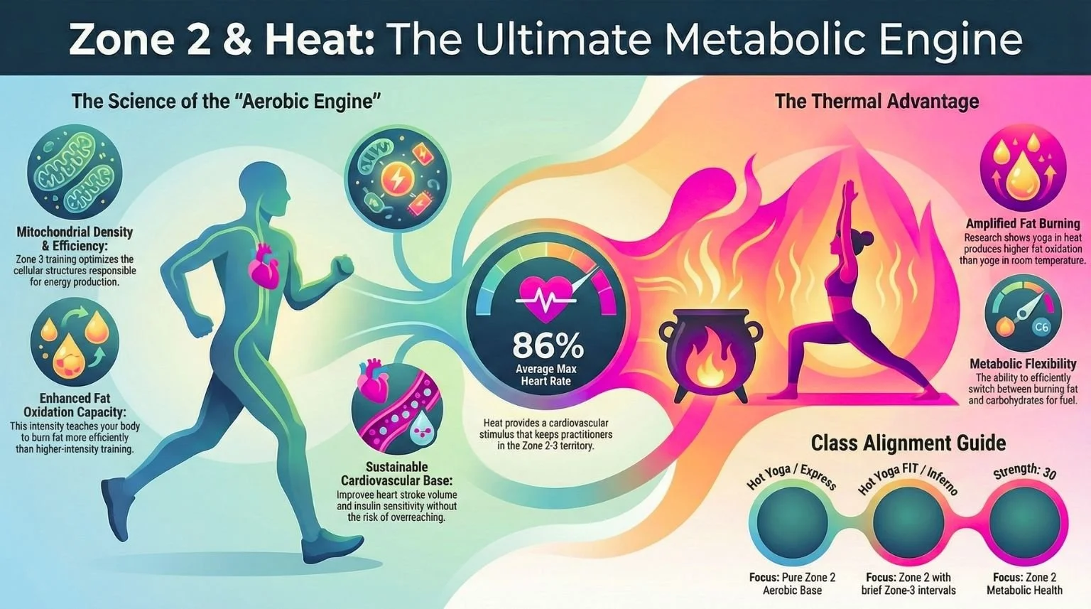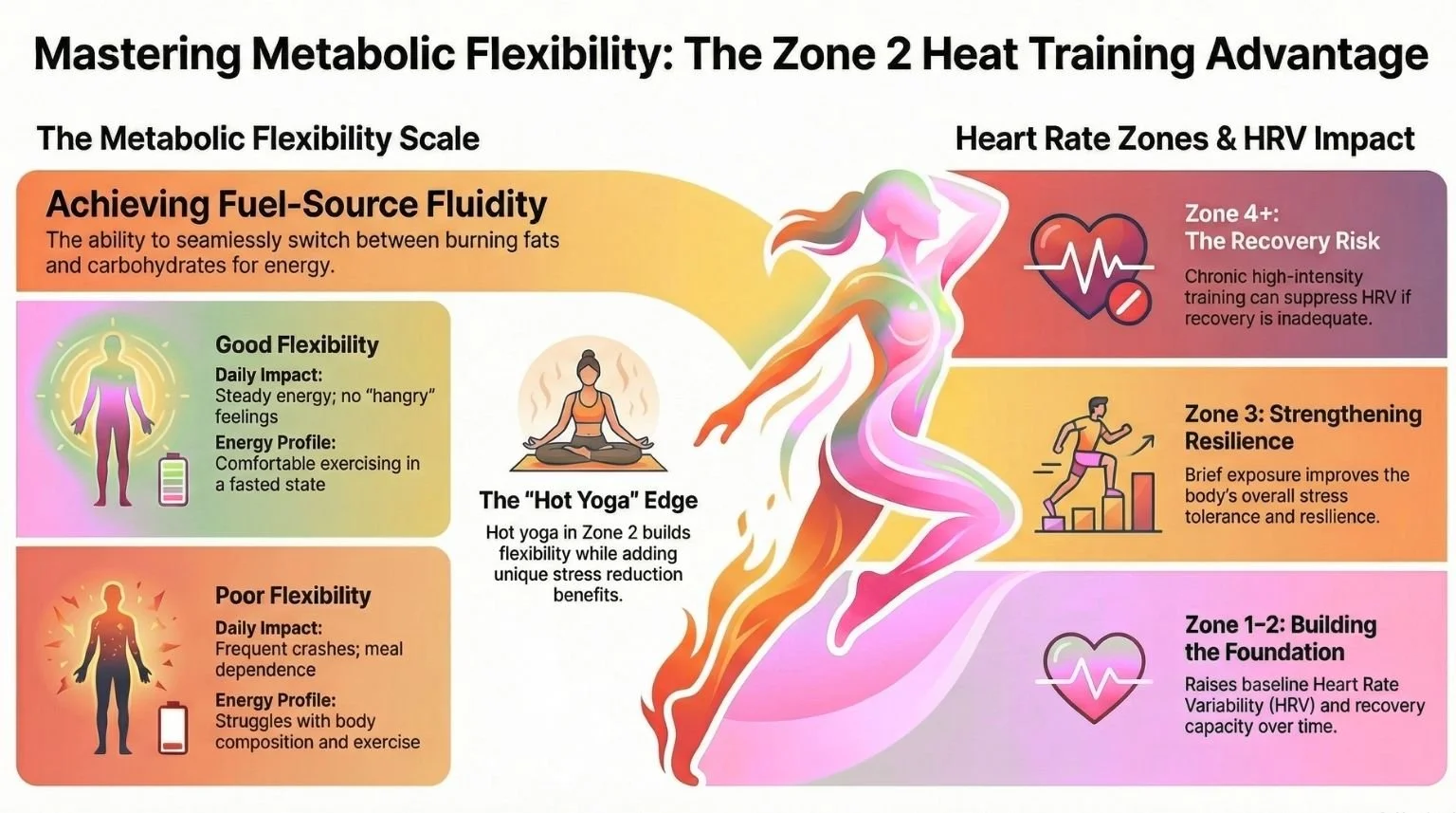 Heat Amplifies Zone-2 Benefits: Lambert et al. (2020) found that yoga performed in heat produced a significantly lower respiratory exchange ratio than thermoneutral yoga, indicating greater relative fat oxidation despite identical caloric expenditure (5).
